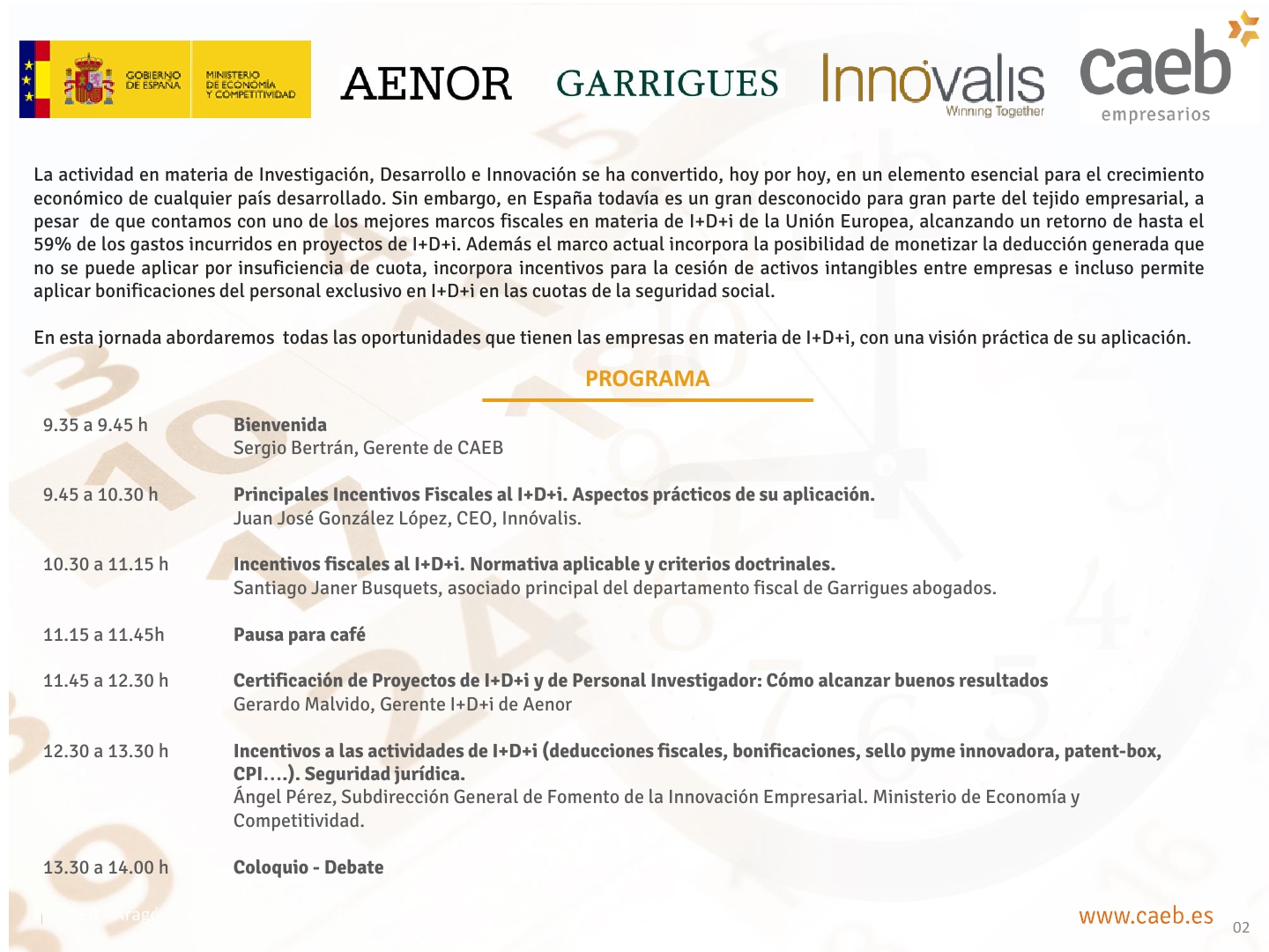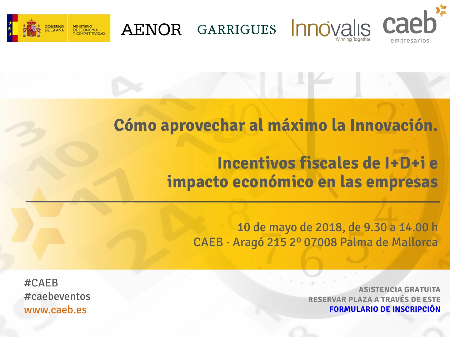 jueves 10th mayo 2018 De 09:30 AM A 02:00 PM Calle Aragón 215 Palma de Mallorca, España Precio Gratuito Cómo aprovechar al máximo la Innovación. Incentivos fiscales de I+D+i e impacto económico en las empresas Detalles Fecha: 10/05/2018 Hora: 09:30 - 14:00 Precio: Gratuito Categorías del Evento: Economía, Empresas, Innovación Lugar CAEB Mallorca Calle Aragón 215 Palma de Mallorca, Baleares 07008 España Teléfono: 971706010 Página Web: www.caeb.es DESCARGAR PROGRAMA E INSCRIBIRSE + Google Calendar+ Exportar iCal