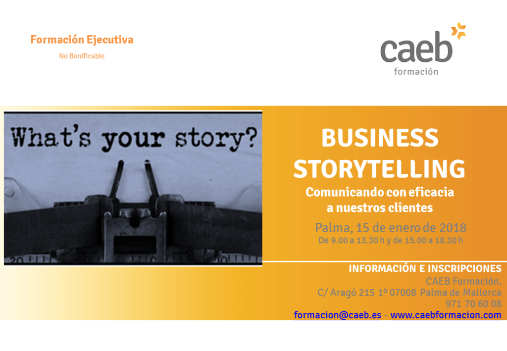 lunes 15th enero 2018 De 09:00 AM A 06:30 PM , Precio 280€ BUSINESS STORYTELLING: COMUNICANDO CON EFICACIA A NUESTROS CLIENTES Detalles Fecha: 15/01/2018 Hora: 09:00 - 18:30 Precio: 280€ Categoría del Evento: Formación Página Web: http://www.caebformacion.com/curso/533/business-storytelling-comunicando-con-eficacia-a-nuestros-clientes Organizador Departamento de Formación Teléfono: 971706008 Email: form@bsef.es Página Web: www.bsef.es FORMACIÓN EJECUTIVA DESCARGAR PROGRAMA INSCRIPCIÓN ONLINE + Google Calendar+ Exportar iCal