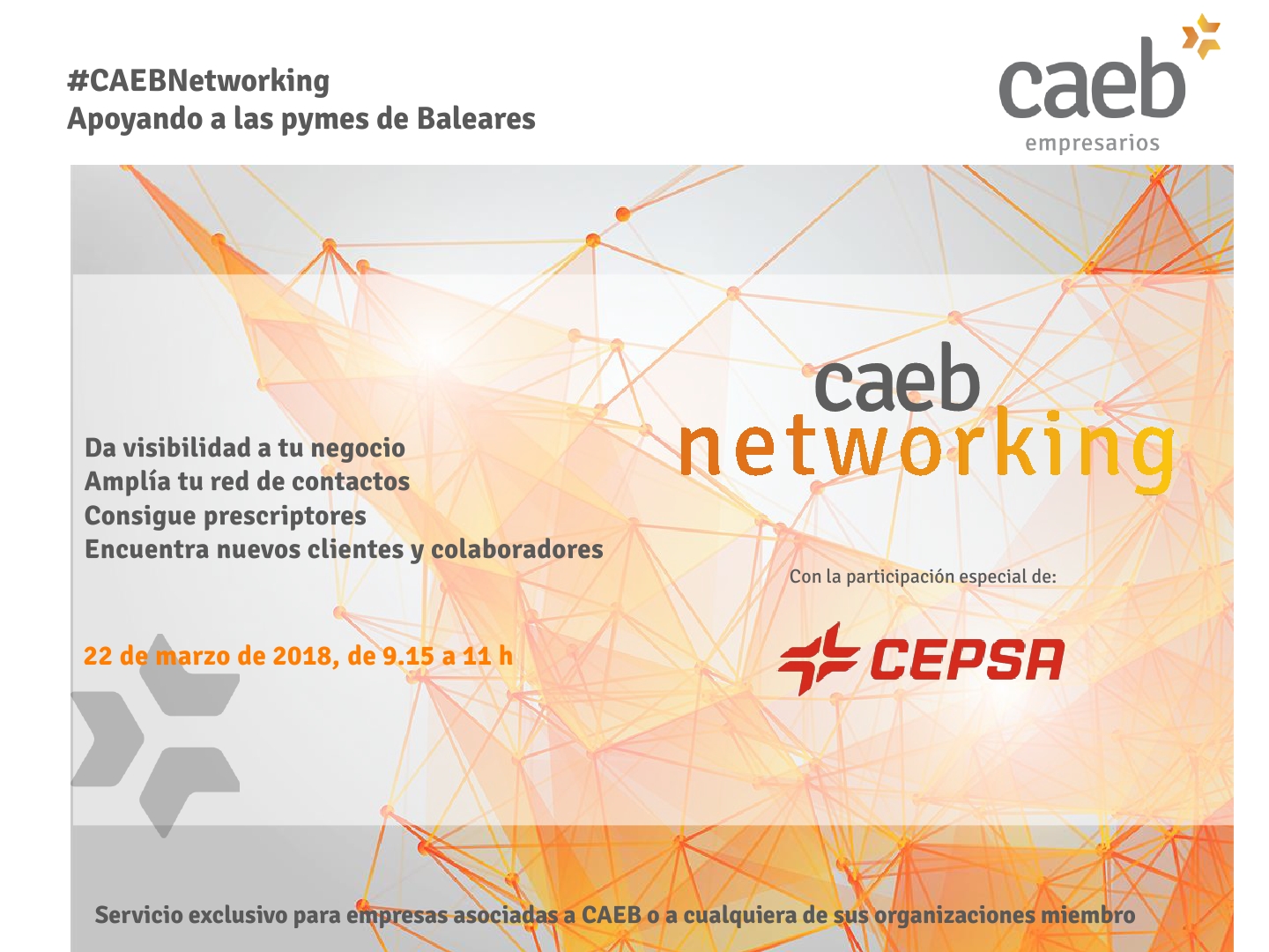 jueves 22nd marzo 2018 De 09:15 AM A 11:00 AM Calle Aragón 215 Palma de Mallorca, España Precio Gratuito CAEB NETWORKING Detalles Fecha: 22/03/2018 Hora: 09:15 - 11:00 Precio: Gratuito Categorías del Evento: Empresas, Networking Lugar CAEB Mallorca Calle Aragón 215 Palma de Mallorca, Baleares 07008 España Teléfono: 971706010 Página Web: www.caeb.es DESCARGAR PROGRAMA Y SOLICITAR PLAZA + Google Calendar+ Exportar iCal