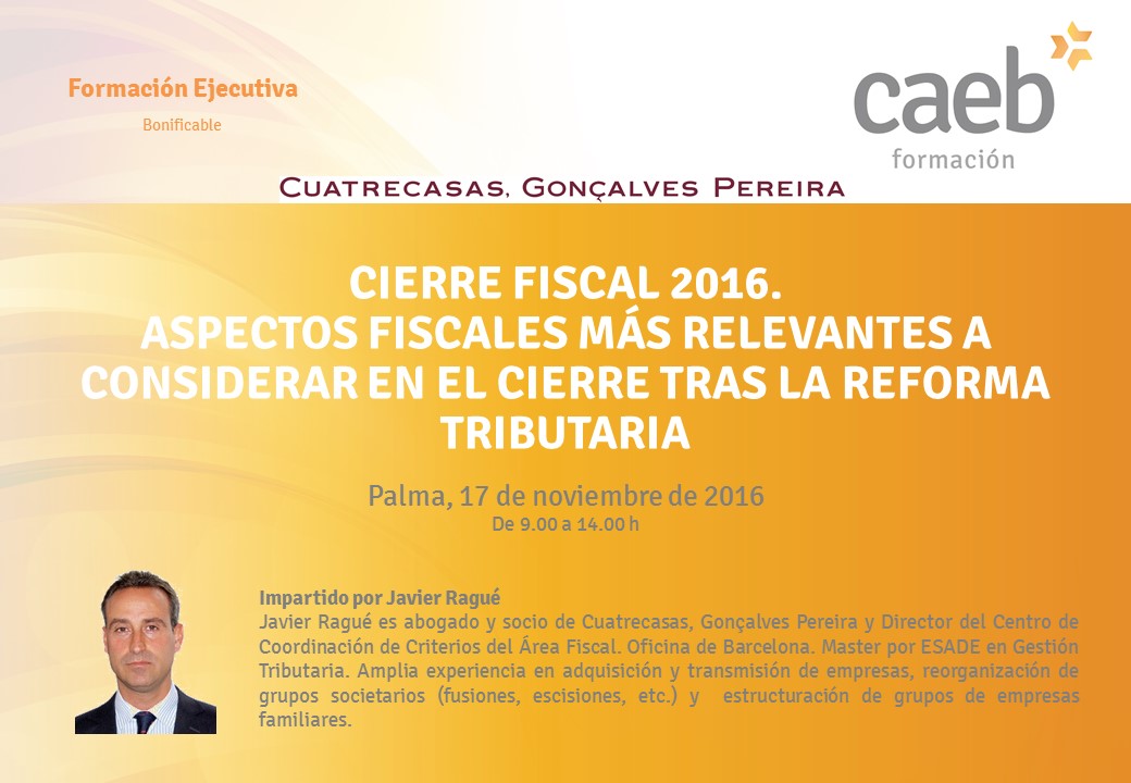 jueves 17th noviembre 2016 De 09:00 AM A 02:00 PM Calle Aragón 215 Palma de Mallorca, España Precio 190€ Cierre Fiscal 2016 Detalles Fecha: 17/11/2016 Hora: 09:00 - 14:00 Precio: 190€ Categoría del Evento: Formación Página Web: http://www.caebformacion.com/curso/inscripcion-online/439/cierre-fiscal-2016-aspectos-fiscales-mas-relevantes-a-considerar-en-el-cierre-tras-la-reforma-tributaria Organizador Departamento de Formación Teléfono: 971706008 Email: form@bsef.es Página Web: www.bsef.es Lugar CAEB Mallorca Calle Aragón 215 Palma de Mallorca, Baleares 07008 España + Google Map Teléfono: 971706010 Página Web: www.caeb.es FORMACIÓN EJECUTIVA DESCARGAR PROGRAMA INSCRIPCIÓN ONLINE + Google Calendar+ Exportar iCal