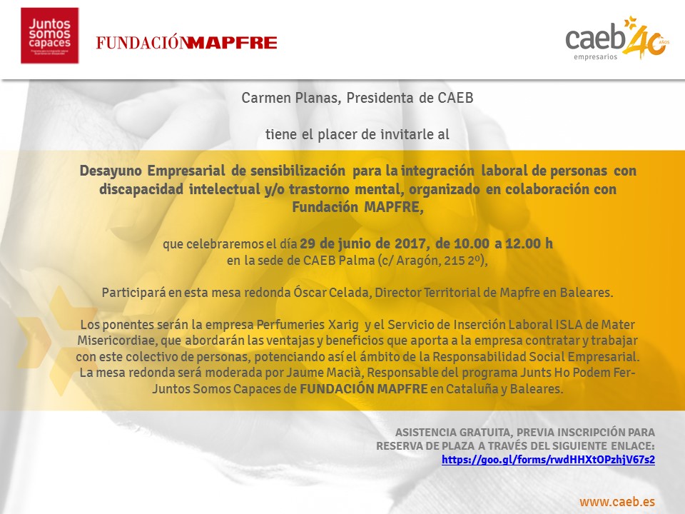 jueves 29th junio 2017 De 10:00 AM A 12:00 PM Calle Aragón 215 Palma de Mallorca, España Precio Gratuito Desayuno Empresarial de sensibilización para la integración laboral de personas con discapacidad intelectual y/o trastorno mental Detalles Fecha: 29/06/2017 Hora: 10:00 - 12:00 Precio: Gratuito Categorías del Evento: Empresas, Responsabilidad Social Corporativa Lugar CAEB Mallorca Calle Aragón 215 Palma de Mallorca, Baleares 07008 España Teléfono: 971706010 Página Web: www.caeb.es DESCARGAR INVITACIÓN PLAZAS LIMITADAS: 30 + Google Calendar+ Exportar iCal