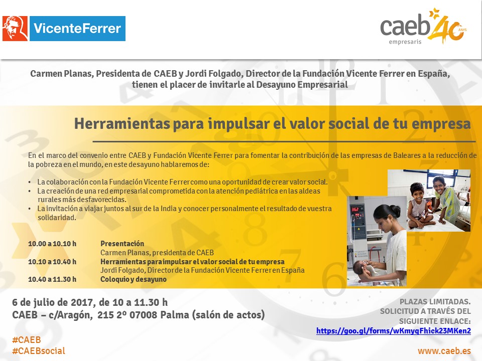 jueves 6th julio 2017 De 10:00 AM A 11:00 AM Calle Aragón 215 Palma de Mallorca, España Precio Gratuito Herramientas para impulsar el valor social de tu empresa Detalles Fecha: 06/07/2017 Hora: 10:00 - 11:00 Precio: Gratuito Categorías del Evento: Empresas, Responsabilidad Social Corporativa Lugar CAEB Mallorca Calle Aragón 215 Palma de Mallorca, Baleares 07008 España Teléfono: 971706010 Página Web: www.caeb.es DESCARGAR INVITACIÓN INSCRIBIRSE + Google Calendar+ Exportar iCal