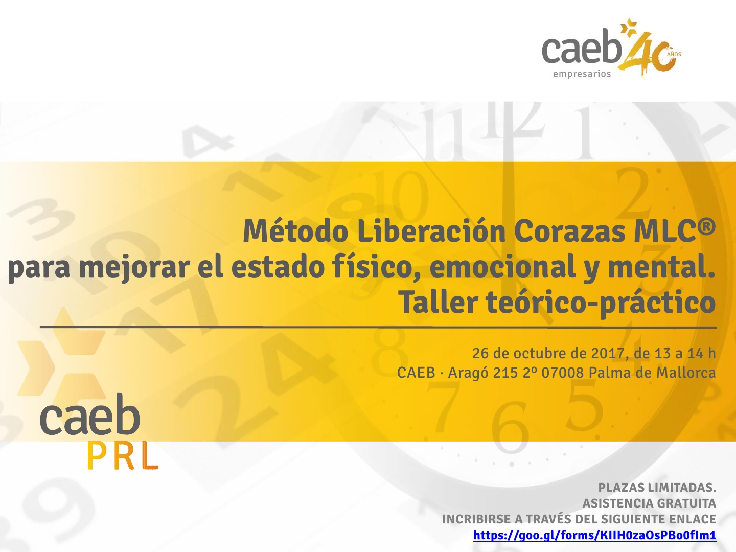jueves 26th octubre 2017 De 01:00 PM A 02:00 PM Calle Aragón 215 Palma de Mallorca, España Precio Gratuito Método Liberación Corazas MLC® para mejorar el estado físico, emocional y mental. Taller teórico-práctico Detalles Fecha: 26/10/2017 Hora: 13:00 - 14:00 Precio: Gratuito Categorías del Evento: Empresas, Seguridad y Salud Laboral Lugar CAEB Mallorca Calle Aragón 215 Palma de Mallorca, Baleares 07008 España Teléfono: 971706010 Página Web: www.caeb.es DESCARGAR PROGRAMA INSCRIBIRSE + Google Calendar+ Exportar iCal
