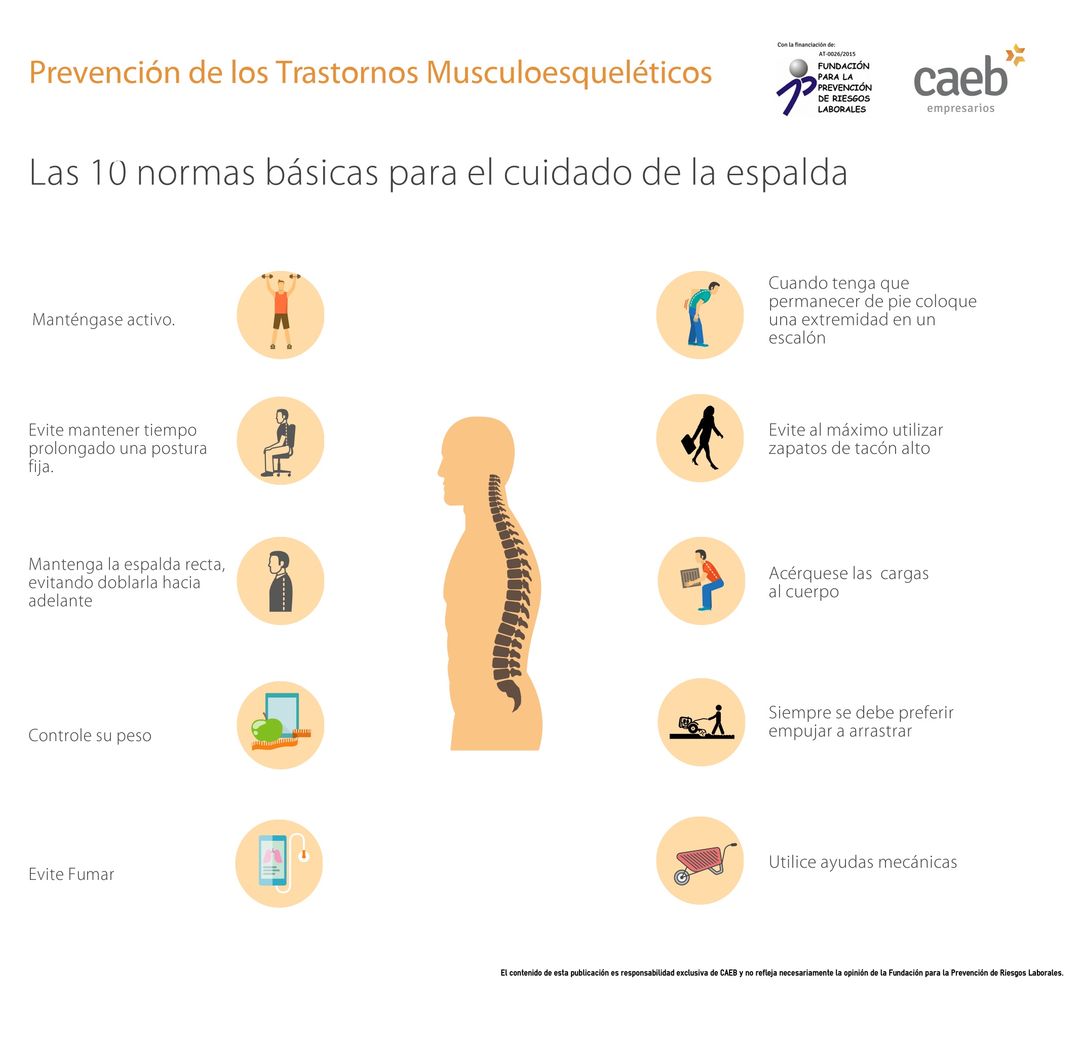 La prevención en este ámbito se basa en el diseño ergonómico de los puestos de trabajo y en la atención a los factores psicosociales, así como en el aprendizaje y mantenimiento de posturas correctas y ejercicios físicos adecuados. Como parte del Programa de Información y Sensibilización para la Prevención de los Trastornos Musculoesqueléticos y la promoción de buenas prácticas empresariales y de hábitos saludables desarrollado por CAEB con la financiación de la Fundación para la Prevención de Riesgos Laborales (AT-0026/2015) hemos desarrollado esta Guía informativa para identificar los factores de riesgo y adoptar las medidas de prevención en este ámbito.