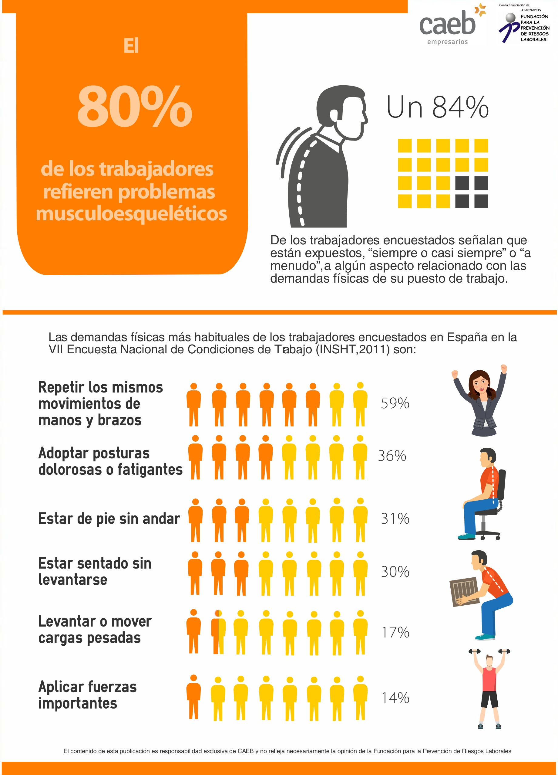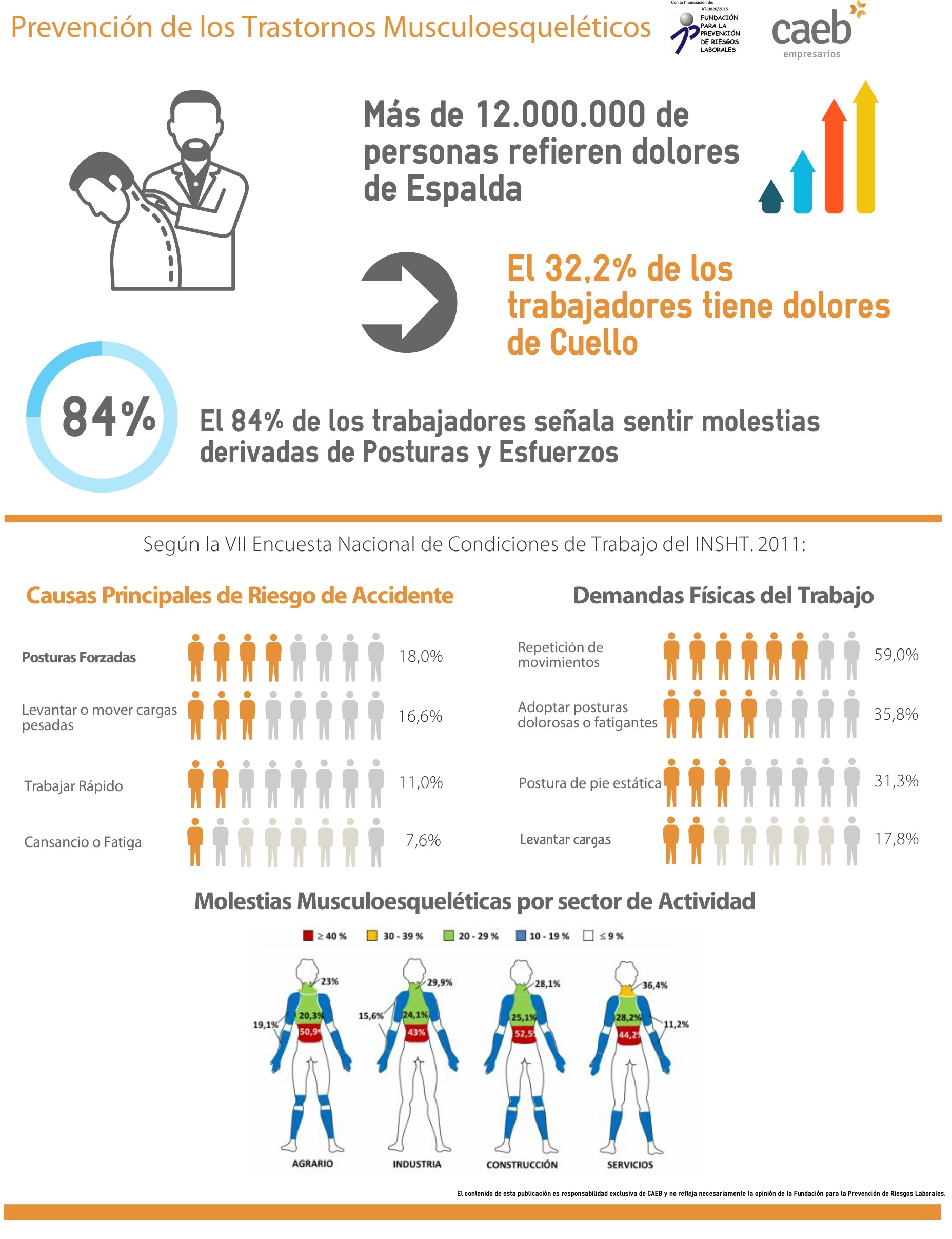 Asimismo, el Instituto Nacional de Seguridad e Higiene en el Trabajo destaca que en el año 2011 se comunicaron 197.381 accidentes de trabajo en jornada por sobreesfuerzos, lo que representa un 38,5% de los accidentes laborales, y se notificaron, a través del sistema CEPROSS, 12.891 trastornos musculoesqueléticos, lo que representa un 71,1% del total de enfermedades profesionales comunicadas en ese año. A su vez, según datos del INSS, la primera causa de incapacidad temporal por enfermedad común es la lumbalgia. Asimismo, en la VII Encuesta Nacional de Condiciones de Trabajo se contempla que un 84% de los trabajadores encuestados señala que está expuesto, “siempre o casis siempre” o “a menudo” a algún aspecto relacionado con las demandas físicas de su puesto de trabajo, siendo el porcentaje de trabajadores que siente alguna molestia achacable a posturas y esfuerzos derivados del trabajo que realiza del 77,5%.