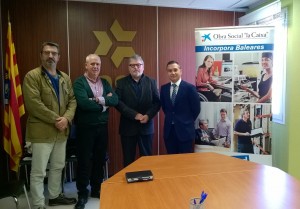 El presidente de la CAEB en Menorca, Joan Melis; el director de área de negocio Menorca de CaixaBank, Toyo Llorens; y el gerente de la Fundació per a Persones amb Discapacitat Illa de Menorca, Andreu Hernández, y el director de Cáritas Diocesana de Menorca, Joan Mir, en representación del Grup Incorpora Balears, han firmado hoy un convenio de colaboración que tiene dos objetivos: fomentar la integración laboral de persones con especiales dificultades para acceder a un puesto de trabajo y permitir a las empresas de la zona llevar a cabo programas de responsabilidad social corporativa.