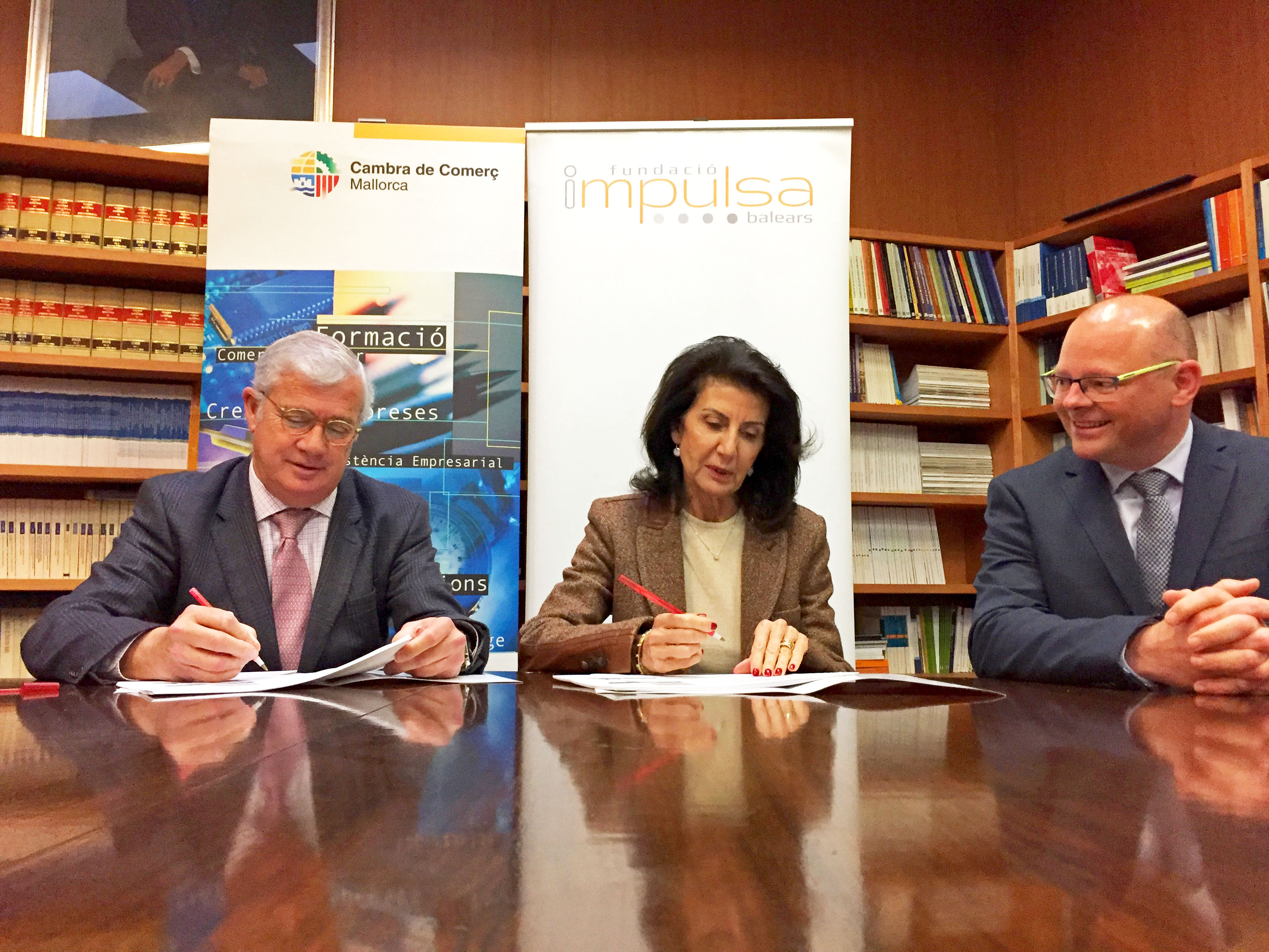 Pie de foto: La presidenta de la Fundació Impulsa Balears, Carmen Planas, y el presidente de la Cámara de Comercio de Mallorca, José Luis Roses, acompañados por el director técnico de Impulsa Balears, Antoni Riera, han firmado el acuerdo de adhesión de la corporación empresarial al patronato de la Fundació.