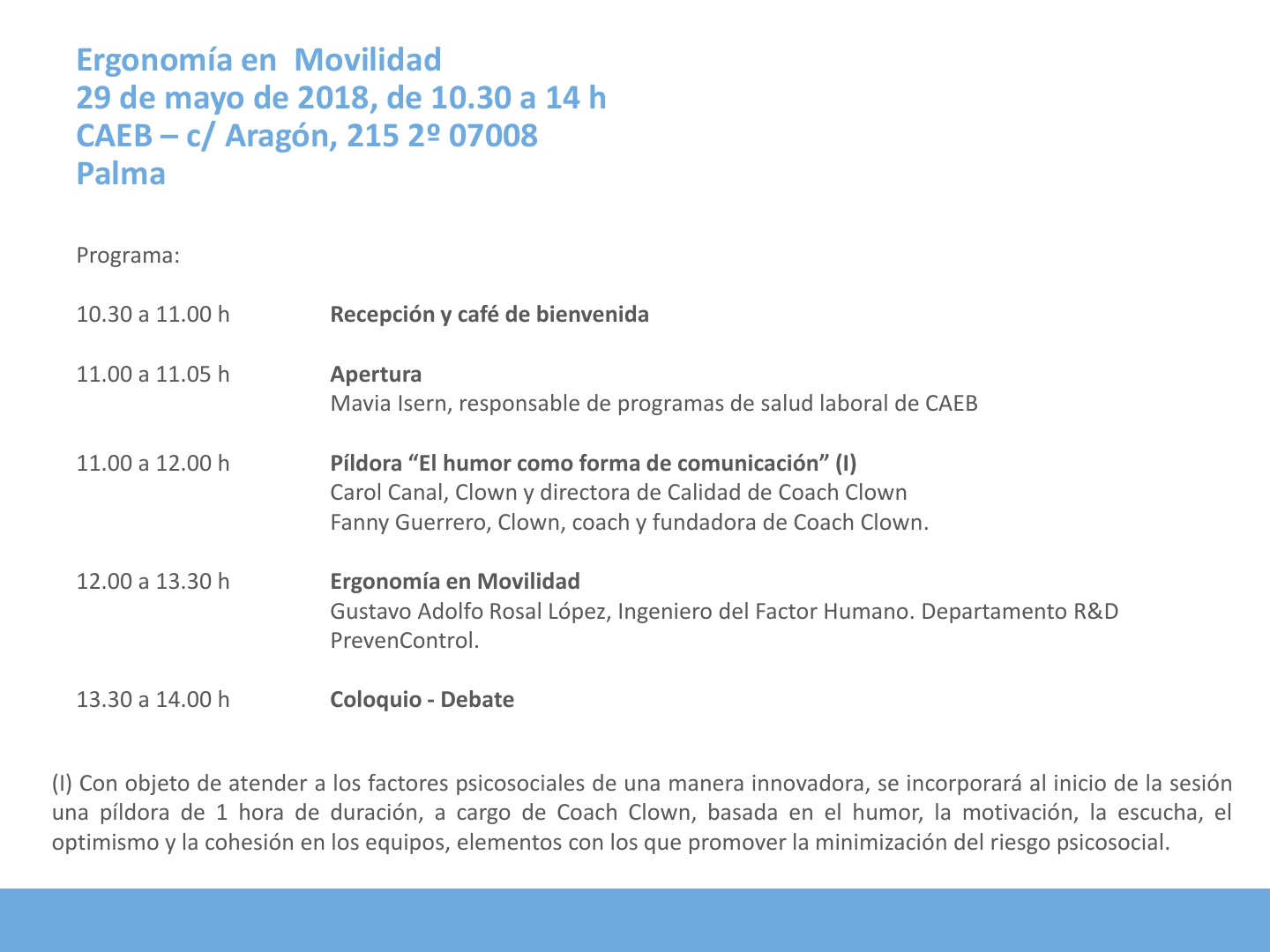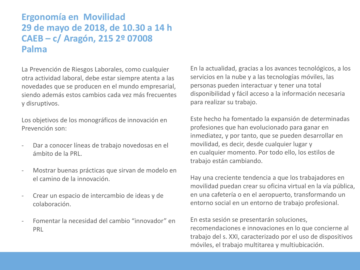 El objeto de esta jornada es la divulgación de los principales criterios de análisis y evaluación de la carga física de trabajo, basándose en parámetros fisiológicos, Norma UNE-EN ISO 8996, tablas y métodos psicofísicos.